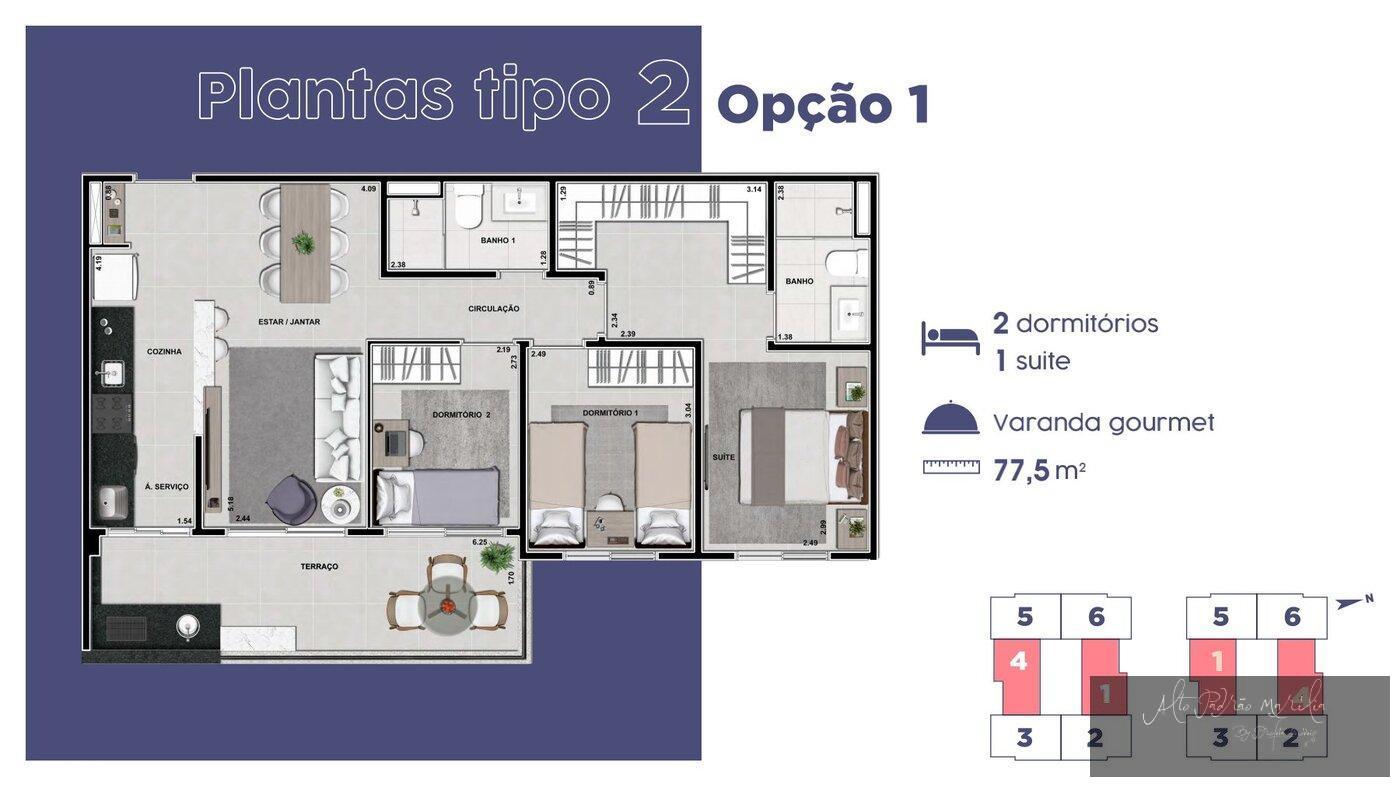 Apartamentos com 5 opcões de planta, 1, 2 ou 3 dormitórios sendo 1 suíte.