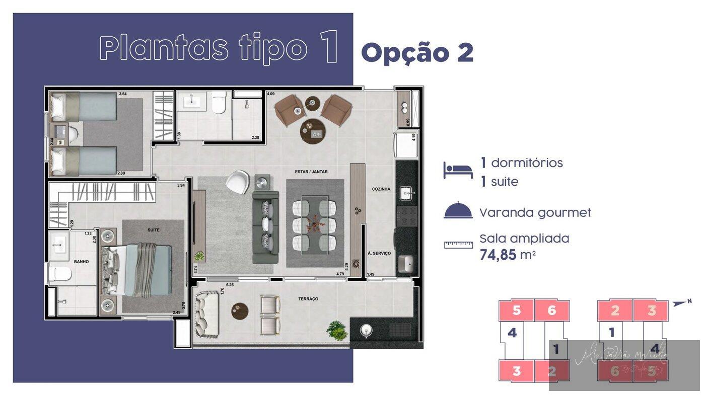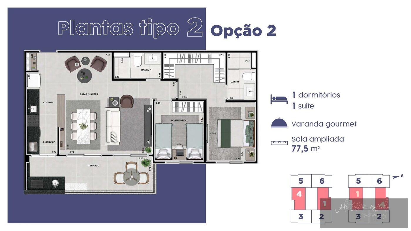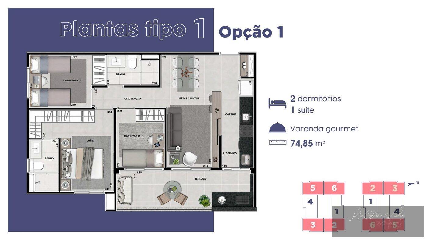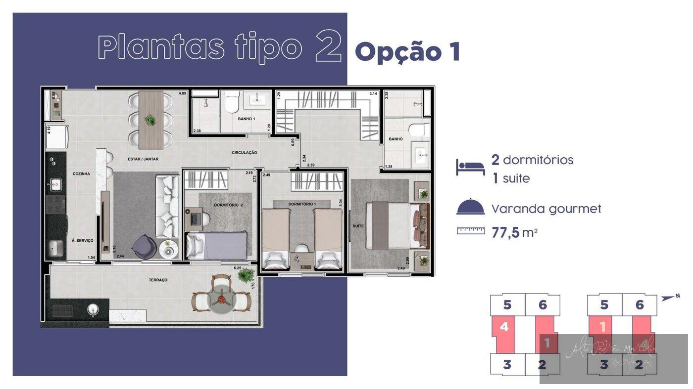 Apartamentos com 5 opcões de planta, 2 ou 3 dormitórios sendo 1 suíte.