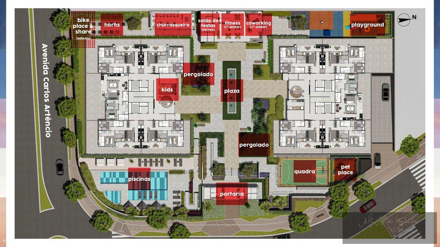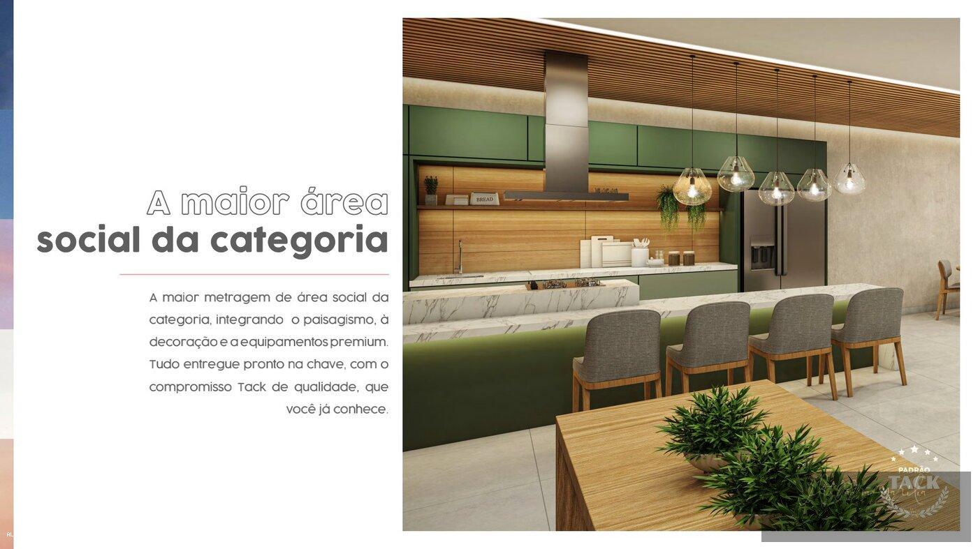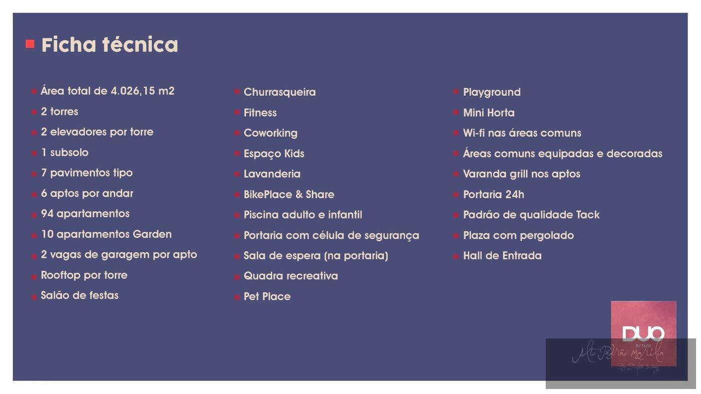 São 2 torres, 2 elevadores  por torre, 1 subsolo, 7 pavimentos tipo, 6 aptos por andar, 94 aptos no total, 10 aptos gardem, 2 vagas de garagem por apto, rooftop por torre, salão de festa, churrasqueira, fitness, coworking, espaço kids, lavanderia, bikeplace & share, piscina adulto e infantil, potaria com célula de segurança, sala de espera na portaria, quadra recreativa, pet place, playground, mini horta, wifi nas áreas comuns, áreas comunus equipadas e decoradas, varanda grill nos aptos, portaria 24hs, padrão de qualidade Tack, plaza com pergolado e hall de entrada.