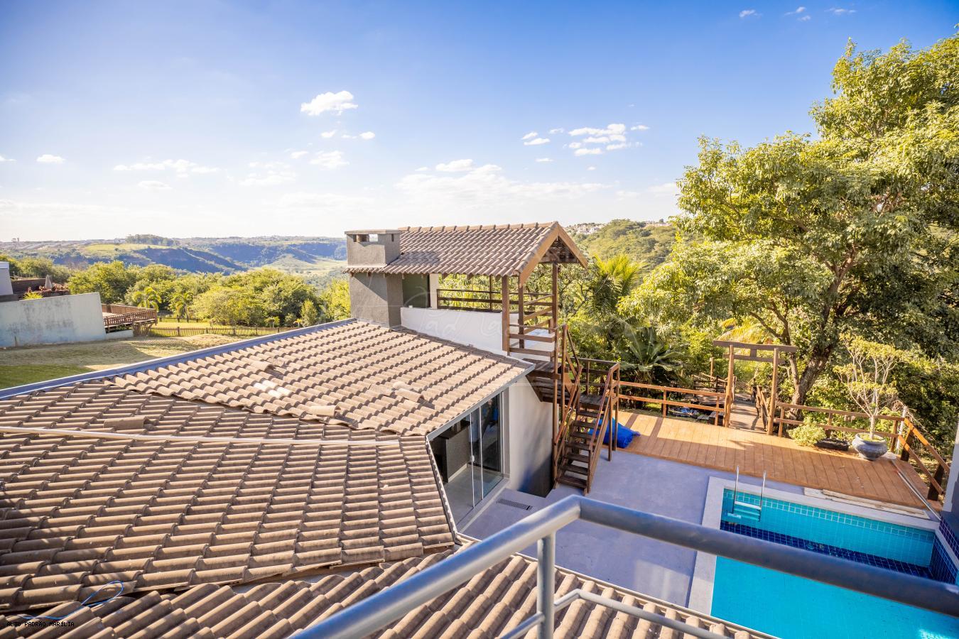Com 5 dormitórios, sendo 5 suítes, possui 4 banheiros, sala para dois ambientes, sala de estar, jardim de inverno com cascata, cozinha estilo americano, área de serviço, quarto empregada, edícula, área de lazer com churrasqueira e piscina, salão de festas com vista para o vale, 2 vagas de garagem coberta, localizado em condomínio.
