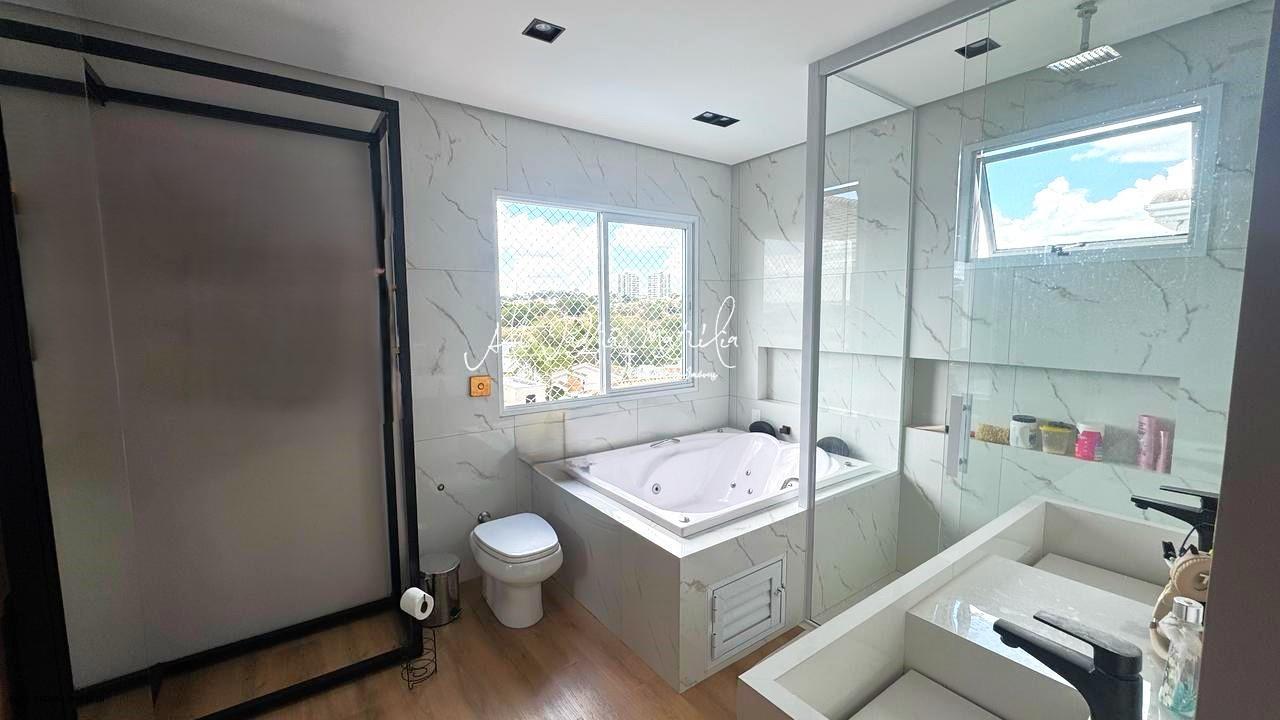 Com 3 dormitórios, sendo 3 suítes com planejados, possui 5 banheiros, escritório, sala para dois ambientes com pé direito alto, cozinha com ilha, área de serviço, área de lazer no nível baixo com churrasqueira e piscina, 2 vagas de garagem, localizado em condomínio.